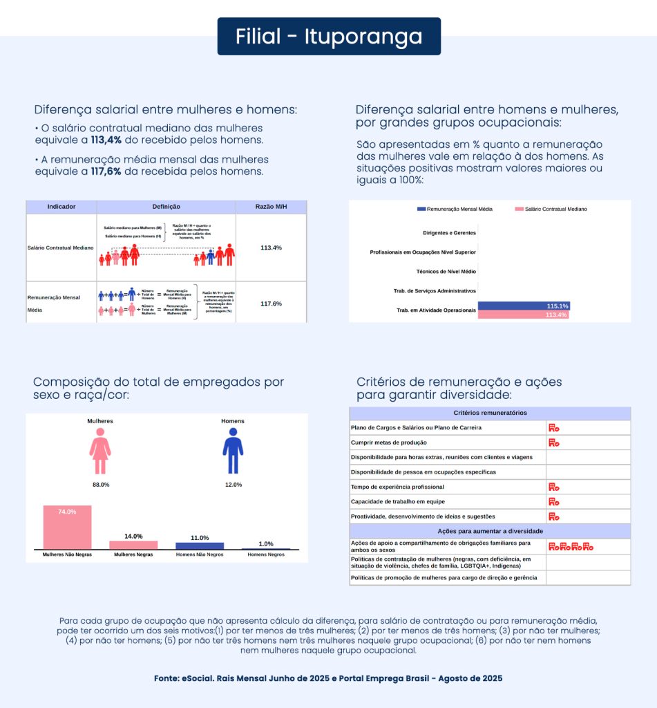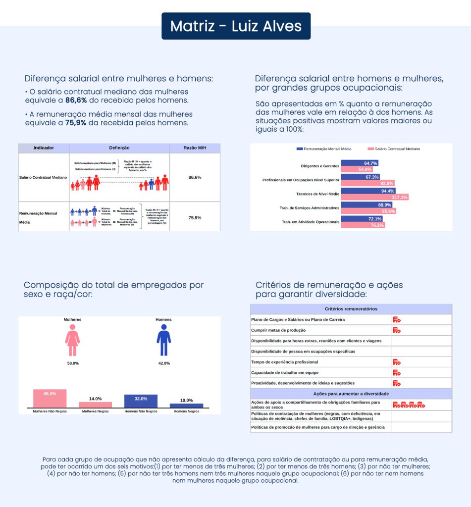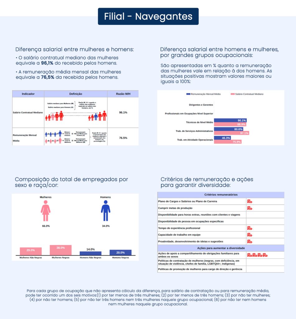Para garantir que todos os nossos colaboradores sejam tratados com justiça e respeito, dedicamos esforços para manter a igualdade salarial e critérios salariais equitativos entre homens e mulheres que desempenham o mesmo trabalho ou ocupam a mesma função. Transparência é fundamental em nosso compromisso com a equidade, por isso que compartilhamos abertamente nossos relatórios sobre essa questão.