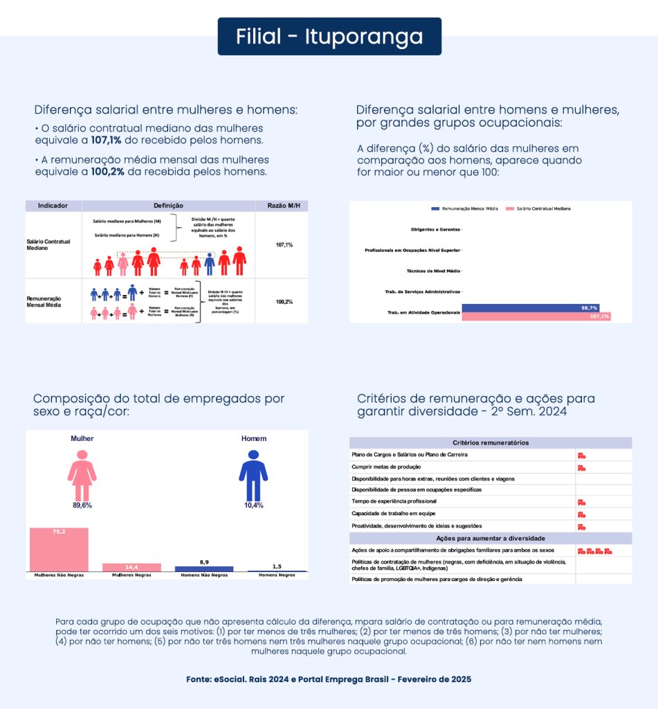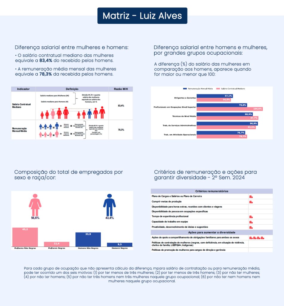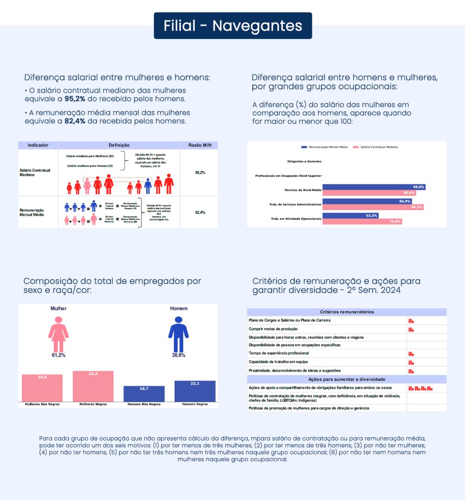 Para garantir que todos os nossos colaboradores sejam tratados com justiça e respeito, dedicamos esforços para manter a igualdade salarial e critérios salariais equitativos entre homens e mulheres que desempenham o mesmo trabalho ou ocupam a mesma função. Transparência é fundamental em nosso compromisso com a equidade, por isso que compartilhamos abertamente nossos relatórios sobre essa questão.