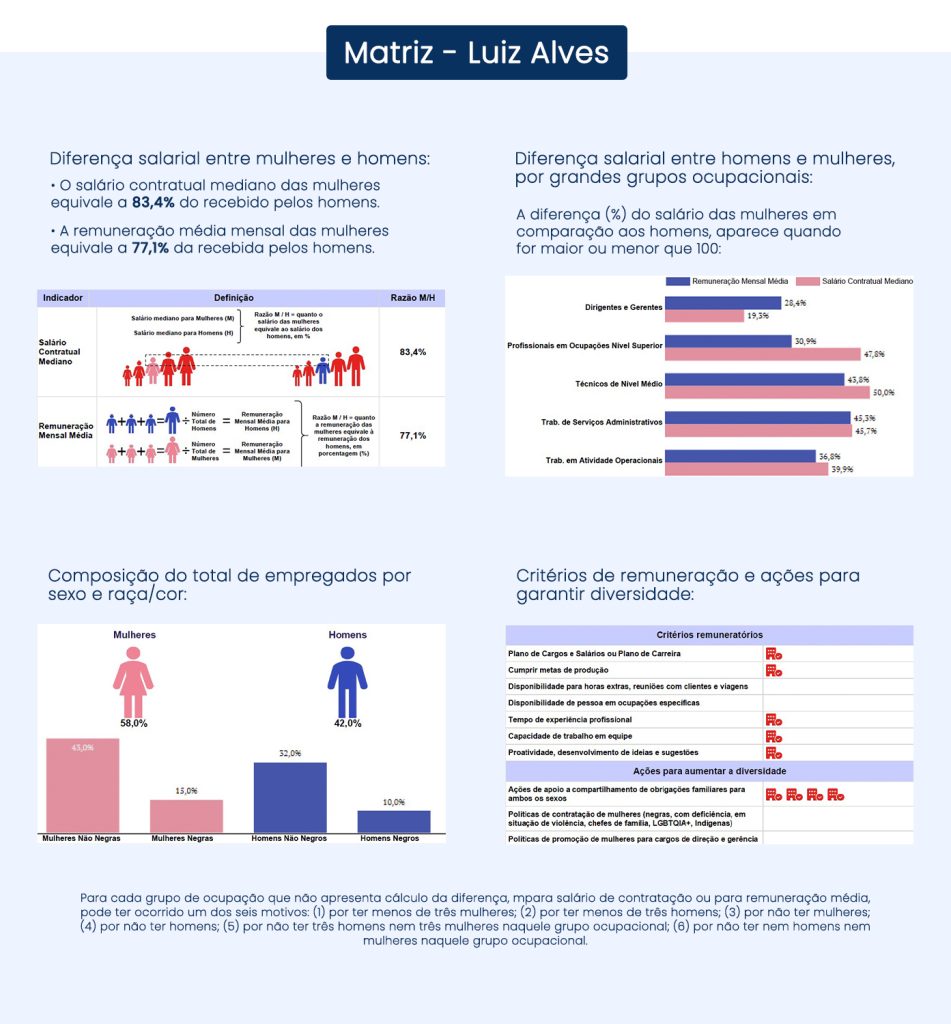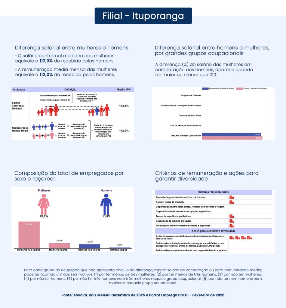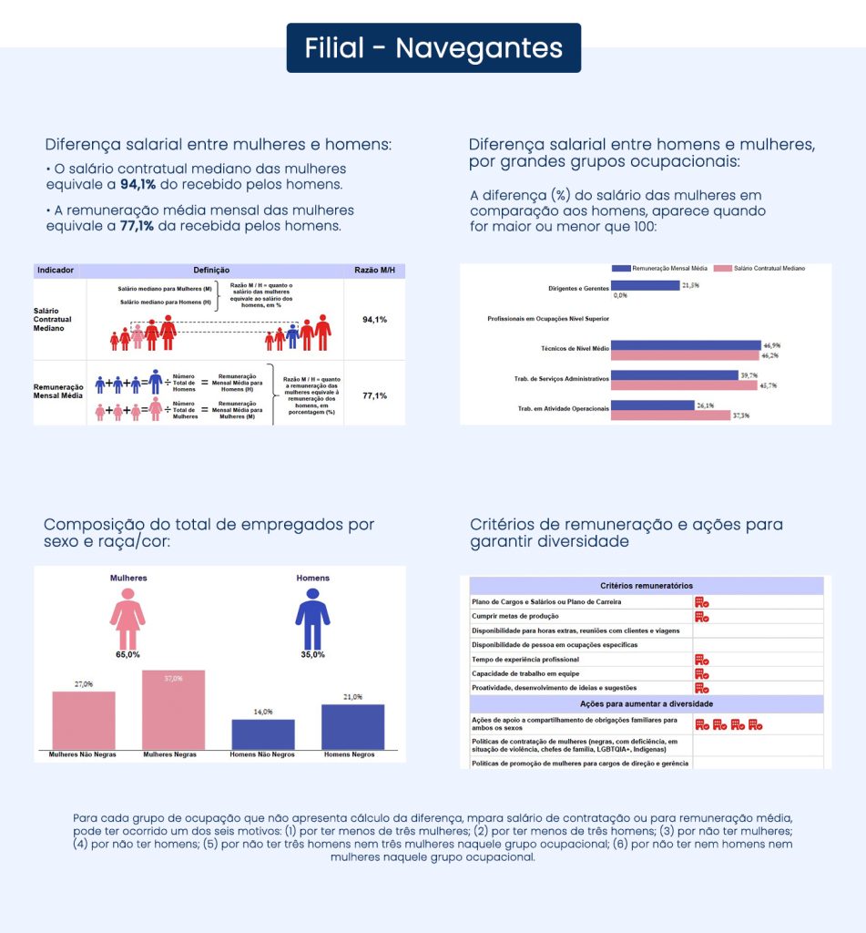 Para garantir que todos os nossos colaboradores sejam tratados com justiça e respeito, dedicamos esforços para manter a igualdade salarial e critérios salariais equitativos entre homens e mulheres que desempenham o mesmo trabalho ou ocupam a mesma função. Transparência é fundamental em nosso compromisso com a equidade, por isso que compartilhamos abertamente nossos relatórios sobre essa questão.